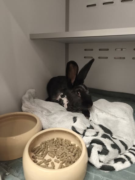 Cette adorable lapine de ferme de 1 an est arrivée au refuge avec une patte cassée… Nos vétérinaires l’ont opéré en urgence et au vu de la fracture nous n’avons pas eu d’autres choix que d’amputer sa patte…